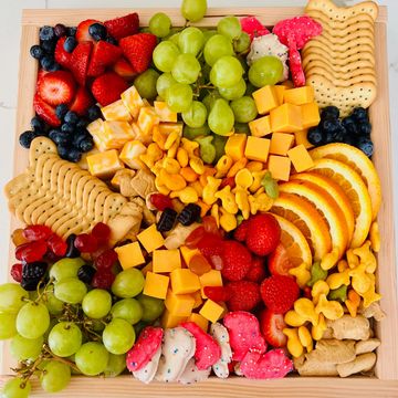 Kid-friendly grazing board includes cheese, fresh fruit, crackers, and other fun goodies.
