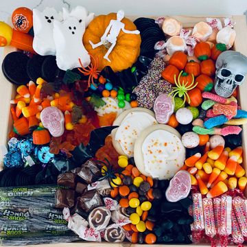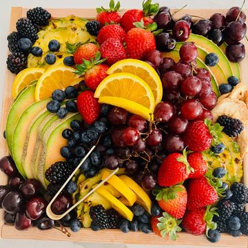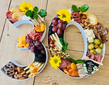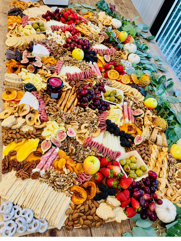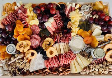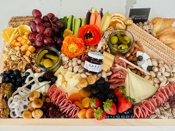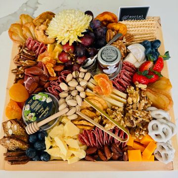 Includes cheese, charcuterie, olives, honey, crackers and assorted nuts, veggies, fresh & dried fruit.