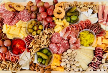Assorted cured meats, cheeses, olives, pickled vegetables, nuts and varying accoutrements.