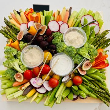 Assorted seasonal & locally-grown veggies, 1-2 dips, and varying accoutrements (fruit, etc.)