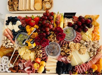 Includes cheese, charcuterie, honey, crackers and assorted nuts, fresh & dried fruit.