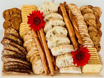 Artisan cheeses, charcuterie, assorted fresh & dried fruit, olives, nuts, with honey/jam. Crackers served on a separate tray.