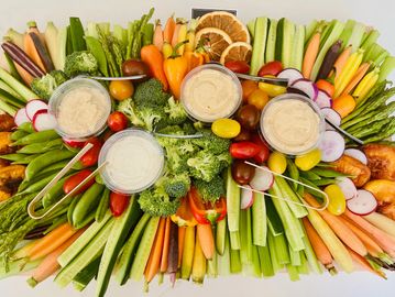 Assorted seasonal & locally-grown veggies, 2-3 dips and varying accoutrements (fruit, etc.)